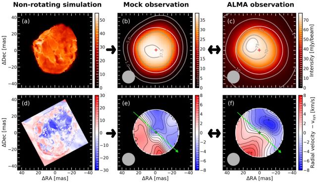 Kırmızı süperdev yıldızlar gibi Betelgeuse’u modelleyen ve dev konveksiyon tarafından yönetilen, dönmeyen modeller oluşturdular ve sonuçları ALMA’dan sentezlenmiş gözlemler olarak işlediler. Simülasyonları, kırmızı süperdevin bir tarafında yükselen dev konveksiyon hücrelerini ve diğer tarafta çöküp içeri düşen bir hücre kümesini gösterdi. ALMA’nın bu konveksiyon hücrelerini tanımlama çözünürlüğü yoktur; bunun yerine, teleskoptan gelen veriler dönüşe çok benzer görünebilir. Araştırmacılar, simülasyonların yüzde doksanında, ALMA kullanılarak yapılan gözlemlerin saniyede birkaç kilometre hızda dönüş gibi görüneceğini gösterdi.