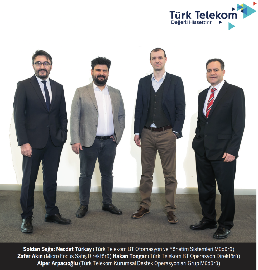 Dijital dönüşümle birlikte yeni teknolojilerin oluşturduğu ortamları izlemek için çok fazla entegrasyon gerekiyor. Büyük veriyi analiz eden akıllı izleme araçlarına ihtiyaç artıyor. Bu ihtiyaçtan yola çıkan Türk Telekom, müşteri deneyimlerinin izlenmesi ve iyileştirilmesi için yeni nesil teknoloji altyapılarını oluşturmaya odaklandı. Aynı zamanda büyük veriyi analiz ederek yönetebilecek bir ortam oluşturmak isteyen şirket, etki analizini hızlı yapan ve kök nedeni tespit edebilecek algoritmaları işleten bir yapılanma için Micro Focus ile “Müşteri Odaklı İzleme Yönetimi” projesini başlattı. Micro Focus Müşteri Çözüm ekibinin yanı sıra, Türk Telekom BT Operasyon Direktörlüğü desteğiyle, Türk Telekom Kurumsal Destek Operasyonları Grup Müdürlüğü’ne bağlı BT Otomasyon ve Yönetim Sistemleri Müdürlüğü koordinasyonunda 4 grup müdürlüğü ve 22 müdürlük projede paydaş olarak çalışmaya katkı sağladı.