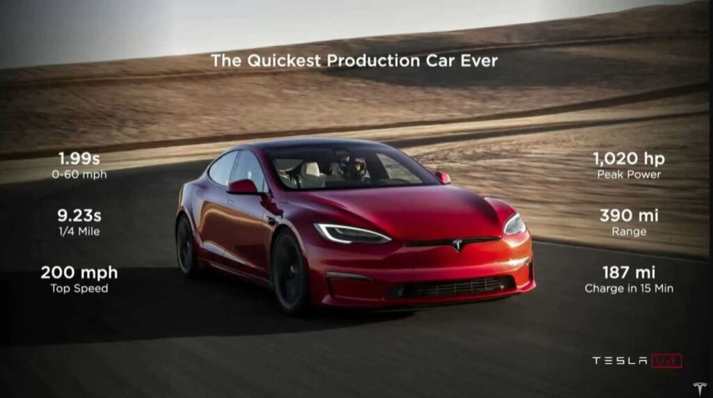 Tesla Model S Plaid: 2,1 saniyede 0’dan 100 kilometre hıza ulaşan Tesla Model S Plaid, Rimac Nevera’den 0,25 saniye daha yavaştır.