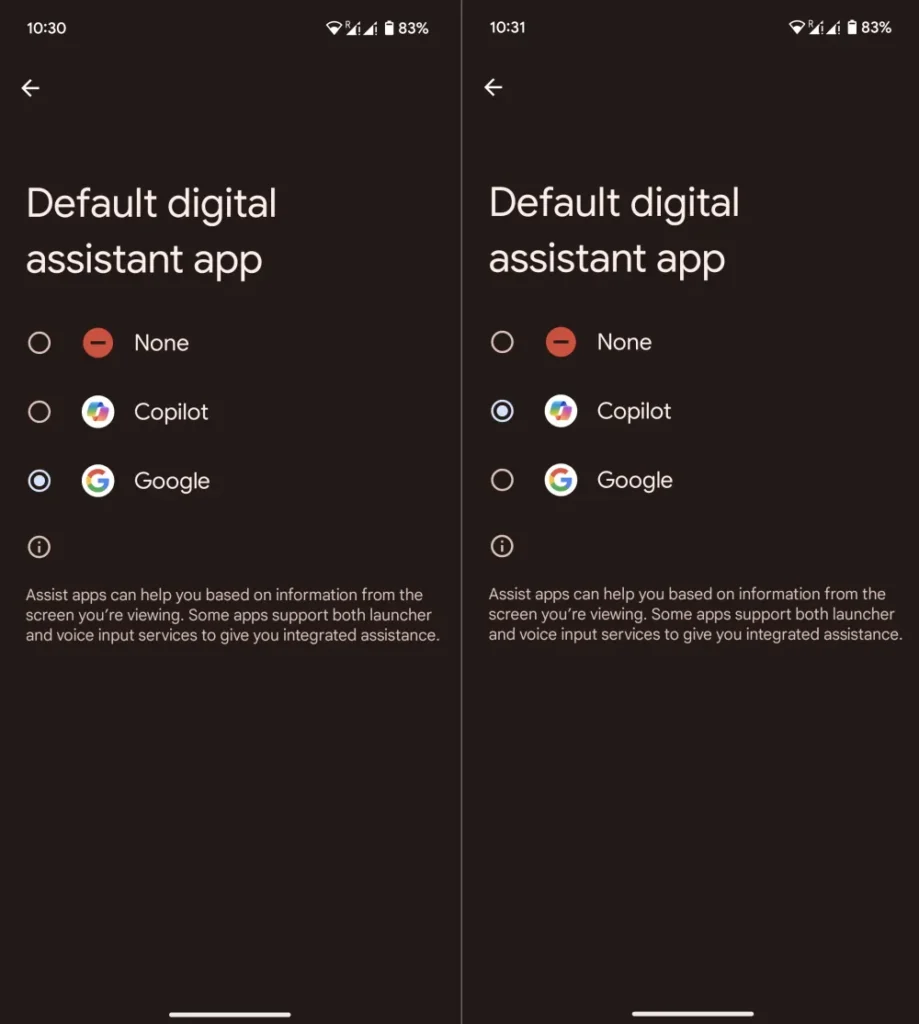 Varsayılan Asistanı Ayarlama: Android cihazınızın ayarlarına gidin ve “Uygulamalar” ayarına tıklayın. Ardından, “Varsayılan Uygulamalar” seçeneğine gidin. “Dijital asistan uygulaması”na ve ardından “Varsayılan dijital asistan uygulaması” seçeneğine tıklayın. Listeden “Copilot” seçeneğini seçin ve açılan pencerede seçiminizi onaylayın.