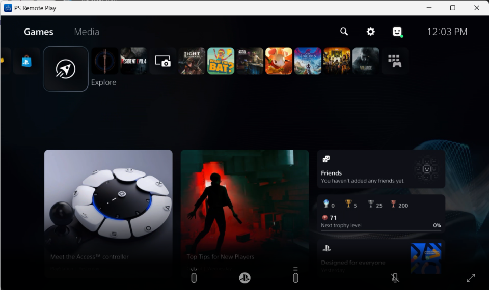 Oyunu Remote Play‘de başlatırsanız, ana ekrana dönmek, ekran görüntüsü almak ve daha fazlasını yapmak için ekranınızın alt kısmında temel kontrolleri göreceksiniz. Oturumu sonlandırmaya hazır olduğunuzda pencereden çıkmanız yeterli; uygulamanın konsolunuzla bağlantısı kesilecektir.