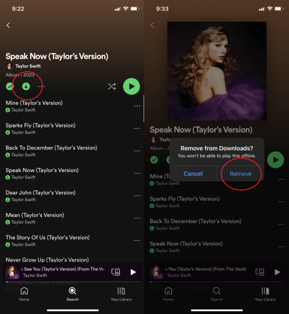 Arayüz, Android ve iOS’ta büyük ölçüde aynıdır. İndirmek istediğiniz albümü veya çalma listesini bulun ve üst sol köşede aşağı ok işaretine dokunun. Albümdeki her şarkının altında aşağı ok işareti mevcut. Bu ikon, indirme tamamlandığında yeşil olacak. Ne kadar süreceği ise internet hızınıza bağlıdır.