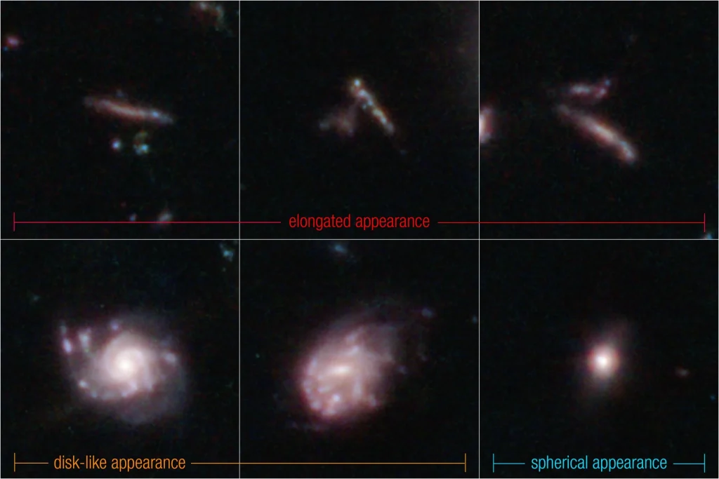 Araştırmacılar, Webb’in verilerini analiz ederek, pek çok uzak galaksinin düz ve uzun oval disk ve tüp şeklinde olduğunu, yani spiral ya da eliptik yapılar olmadığını keşfettiler. Columbia Üniversitesi’nden NASA Hubble Bursiyeri olan Viraj Pandya liderliğindeki ekip, evrenin 600 milyon ila 6 milyar yıl yaşında olduğu zamanlarda, bu galaksilerin yaygın olarak düz ve uzun olduğunu, yani havuz makarnası veya sörf tahtası şeklinde olduklarını buldu. Bu durum, daha yakın galaksilerin genellikle belirgin spiral yapılarla yıldızlarla dolu kolları veya düzgün eliptik yapıları olduğu bilinen durumla çelişiyor.
