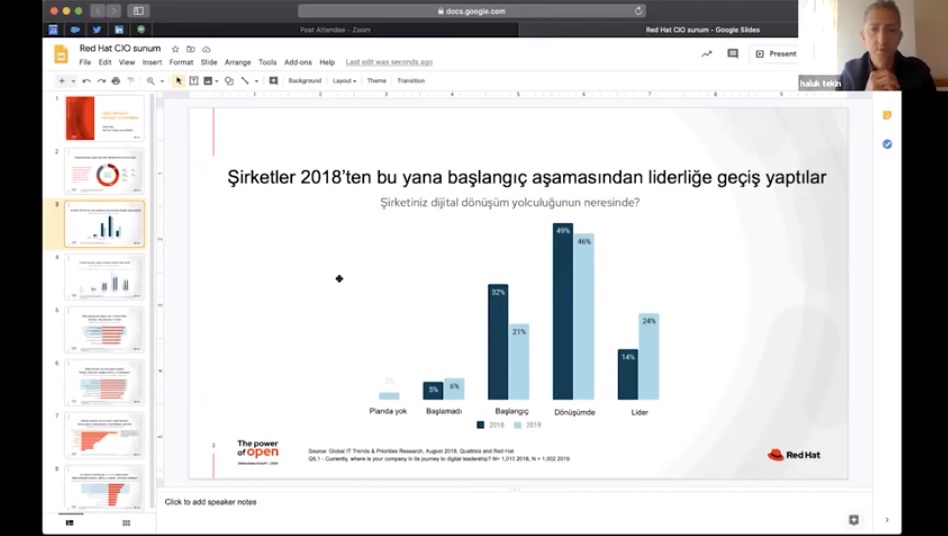 Red Hat’in globalde yaptığı ve her sene tekrar eden CEO araştırmasından söz ederek sözlerine başlayan Red Hat Türkiye Genel Müdürü Haluk Tekin, araştırma konusunun dijital dönüşüme yönelik olduğunu ve CEO’lara sorulan sorular ile alınan cevapların yol gösterici nitelik taşıdığını belirtti. Araştırmada ilginç sonuçların da yer aldığını söyleyen Tekin şöyle devam etti: “Araştırmadaki ilk soru ‘Şirketiniz dijital dönüşüm yolculuğunun neresinde?’ idi. Araştırmaya katılan müşterilerin verdiği cevapların yüzde 46’sına göre, şirketler halen dönüşüm aşamasında ve yüzde 24’ü ise kendilerini kendi sektörlerinde lider konumda görüyor. Dünyada lider konumunda olan üç ana sektör öne çıkıyor: Finansal hizmetler, Telekom ve Sağlık. Dönüşüm aşamasına baktığımız zaman  üretim şirketlerinin diğer firmaları ve sektörleri önümüzdeki senelerde geçebileceğini iddia edebiliriz. Başta belirttiğim soruya kamu tarafından verilen yanıtlara bakacak olursak, yüzde 25 oranında ya ‘planda yok’ ya da ‘başlamadı’ şeklinde dönüşler mevcut ve bu konuda oldukça geride görünüyorlar. Diğer soru ‘Şirketinizin dijital dönüşümünde en önemli faktör nedir?’ oldu. Burada beklenildiği gibi teknoloji en üstte yer alıyor. Özellikle bulut teknolojileri oldukça ön planda. İkinci sırada ise BT ve iş departmanlarının ortak, uyumlu bir şekilde çalışabilmesi bulunuyor. Bu, IT çalışanlarının en önemli bildiği konulardan bir tanesi. 2018’e göre en çok farklılık gösteren üçüncü konu ise IT kültürünün gelişimi. Burada, firmaların dönüşümlü kültürün önemini daha çok anlamaya başladığını söyleyebiliriz.”