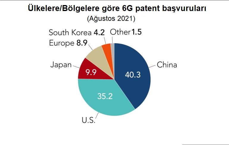 Nikkei Asia ve Tokyo merkezli araştırma şirketi Cyber Creative Institute tarafından yürütülen araştırmaya göre, Çin’in 6G patent başvurularının %40,3’ünü alarak listenin başında geldiğini ve onu %35,2 ile ABD’nin takip ettiğini gösteriyor. Japonya %9,9 ile üçüncü sırada yer alırken, onu %8,9 ile Avrupa ve %4,2 ile Güney Kore izliyor.