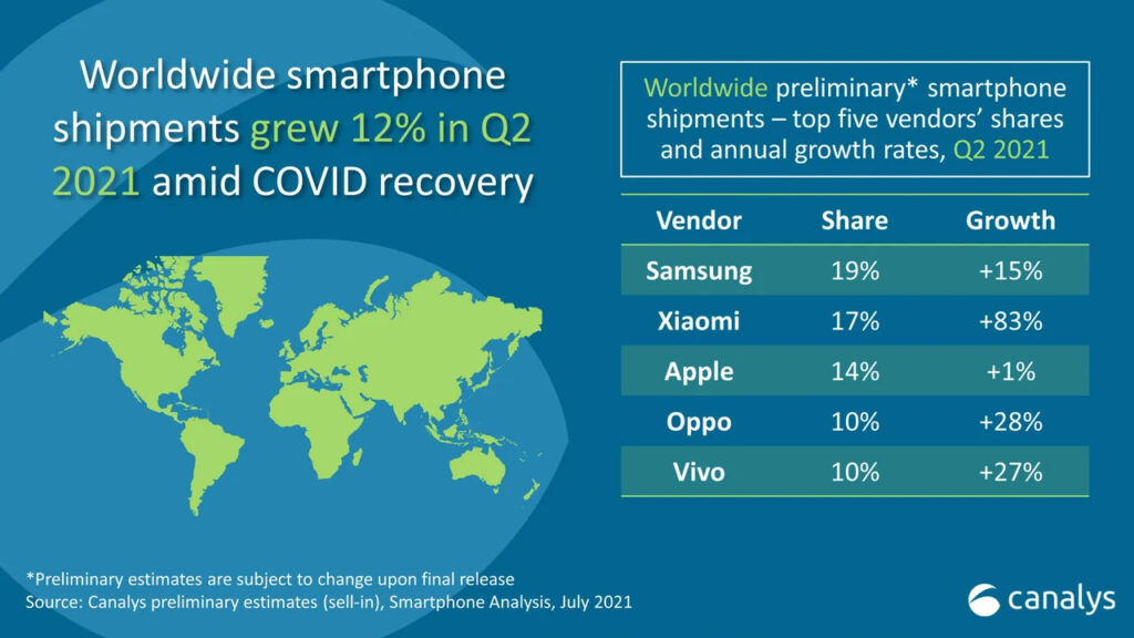 Analiz firması Canalys tarafından açıklanan ve 2021 yılının ikinci çeyreğindeki küresel çapta akıllı telefon sevkiyatlarını gösteren rapora göre lider değişmedi. Adı geçen çeyrekte de küresel bazda akıllı telefon pazarının lideri Samsung olmaya devam ediyor.