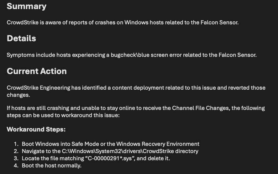 “CrowdStrike is aware of reports of crashes on Windows hosts related to the Falcon Sensor. Symptoms include hosts experiencing a bugcheck\blue screen error related to the Falcon Sensor. Our Engineering teams are actively working to resolve this issue and there is no need to open a support ticket. Status updates will be posted below as we have more information to share, including when the issue is resolved.”