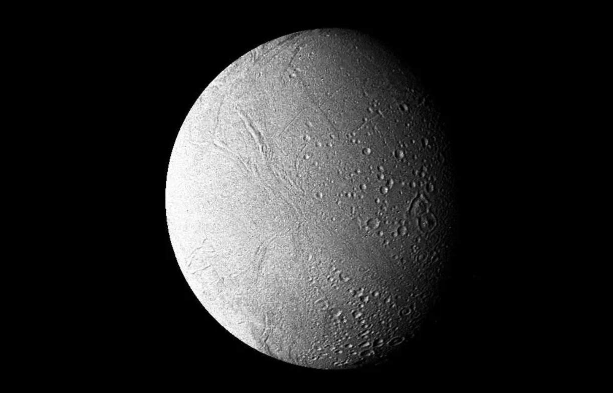 Küçük, soğuk ve çok parlak Enceladus buzlu yüzeyinin altında geniş bir tuzlu su okyanusu içerir. Gayzerler buzlu suyu ve gazı okyanustan uzaya saatte yaklaşık 1287 km hızla Satürn’ün halkalarından birinde son bulur.