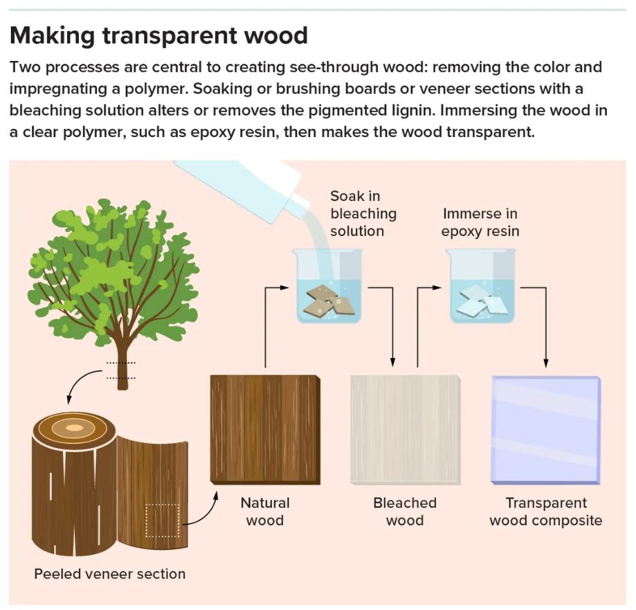 Ahşap, sayısız küçük dikey kanaldan oluşur ve bu kanallar, ağaçlarda su ve besin taşıyan tüp şeklindeki hücrelerdir. Ahşap şeffaflaştırılması için bilim insanları, hücre demetlerini bir arada tutan ve gövdeleri ve dalları kahverengi renklerle kaplayan yapışkan madde olan lignini değiştirmek veya ortadan kaldırmak zorundadır. Lignin renkleri ağartıldıktan veya ortadan kaldırıldıktan sonra, boş hücrelerden oluşan süt beyazı bir iskelet kalır. Hücre duvarları, hücre boşluklarındaki havadan farklı bir derecede ışığı büker ve bu değere kırılma indeksi denir. Hücre boşluklarını hücre duvarları ile benzer bir derecede ışığı büken epoksi reçine gibi bir madde ile doldurmak, ahşabı şeffaf hale getirir.