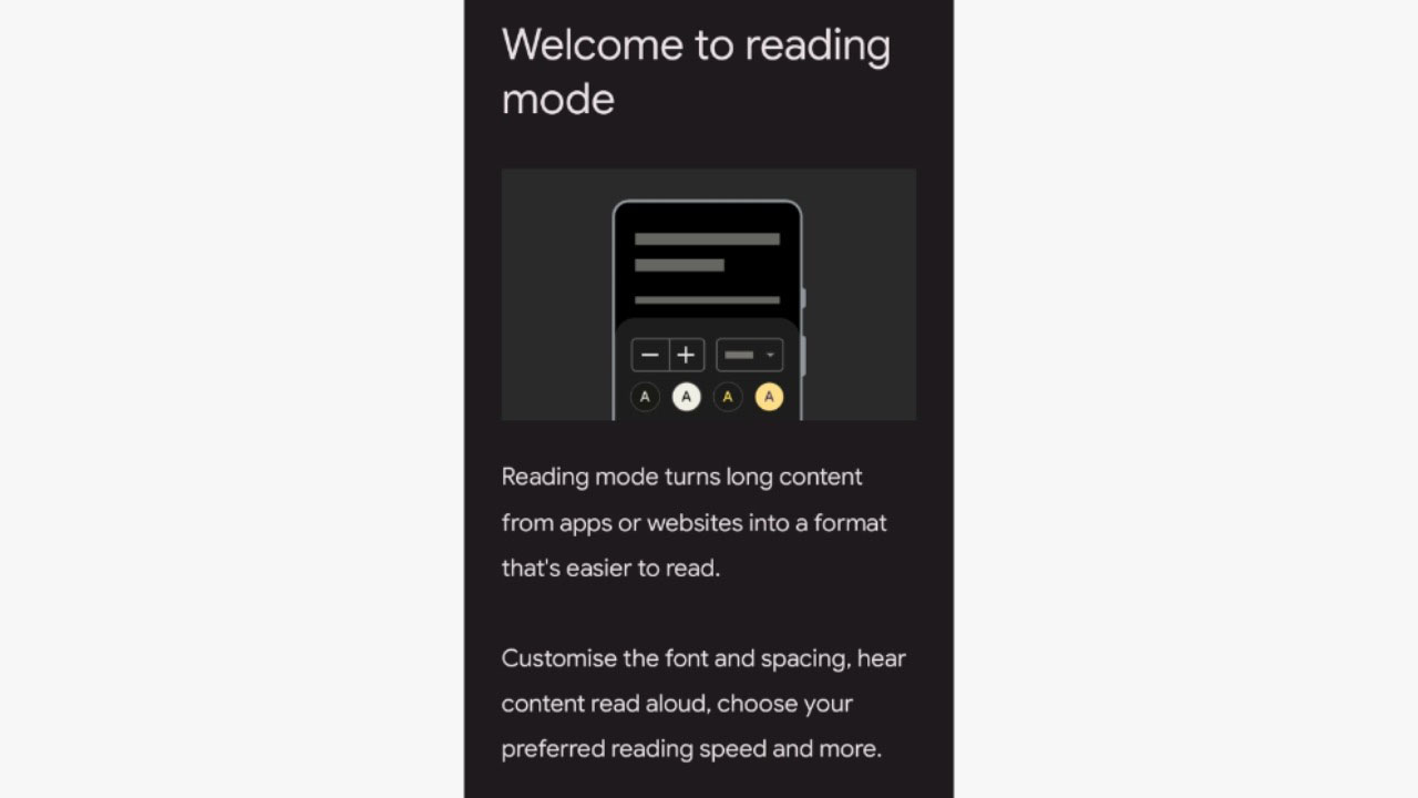 Okuma modu, mevcut ekrandaki içeriği daha basit bir formata dönüştürüyor. Kullanıcılar yeni uygulama ile yazı tipini, boyutunu, kontrastını ve arka plan rengini ayarlayabiliyor. Kullanıcılar ayrıca, uygulamanın seslendirme özelliği sayesinde ekrandaki içerikleri okutabiliyor. Google, Talkback özellikli bir ekran okuyucu ve yerleşik bir Braille klavye dahil olmak üzere bir dizi erişilebilirlik aracı sunuyor. Google’ın yeni okuma modu özelliği, özellikle uzun metinlerin okunmasını ve ekrandaki yazıların seslendirilmesini sağlıyor.