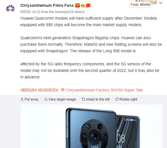 Qualcomm ile geliştirilmiş ortaklığa paralel olarak, Huawei Mate 50 serisi ve gelecek olan Huawei katlanabilir akıllı telefonlar, yeni Snapdragon işlemci tarafından desteklenecek. Ek olarak, bu yeni Snapdragon yonga setlerinin zaten Huawei’nin HarmonyOS işletim sistemini benimsediği ve böylece Huawei’nin küresel uygunluk arayışında erişimini önemli ölçüde genişlettiği anlaşılıyor. Yeni yonga seti, söylentilere göre 2021’in sonundan önce piyasaya sürülebilecek Qualcomm Snapdragon 898. Bununla birlikte, Qualcomm’un yeni çipin premium 5G versiyonunu hemen mi piyasaya süreceği yoksa daha düşük 4G versiyonuyla mı çıkacağı belli değil.