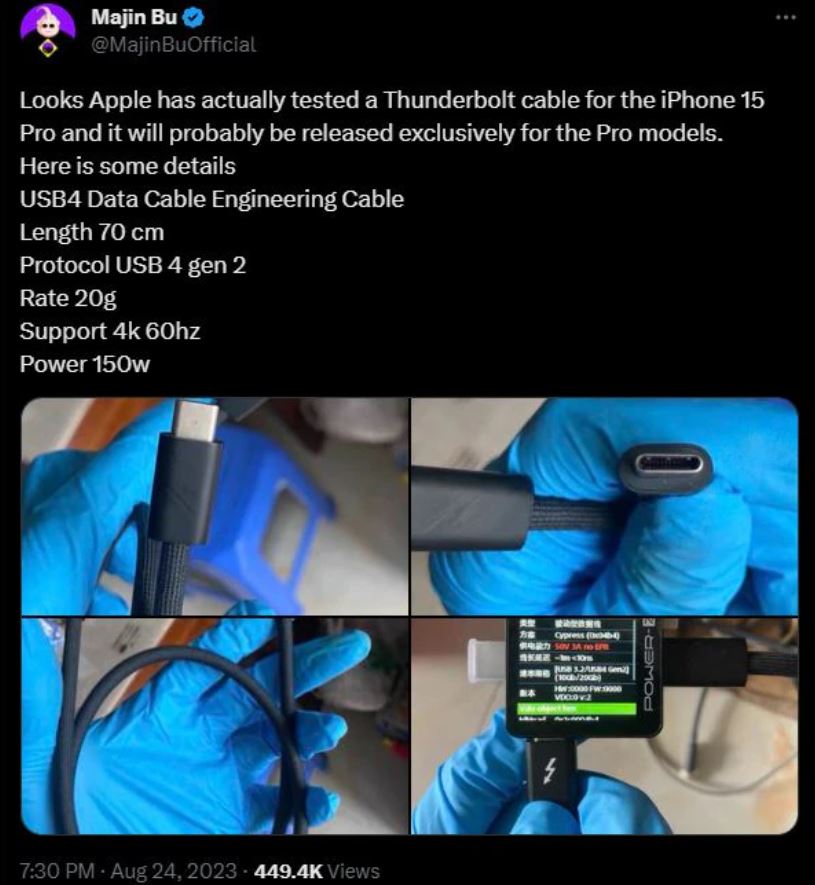 X’te dolaşan çılgın bir söylenti, yakında çıkacak iPhone 15 Pro’nun daha hızlı veri aktarımı için USB 4 Gen 2 protokolünü içeren bir USB-C kablosuyla gelebileceğini öne sürüyor. Üstelik bu kablonun 150W’a kadar güç çıkışı sunacağı görülüyor. Bir X kullanıcısının gönderisi, Apple’ın en yeni iPhone 15 Pro modellerine örgülü Type-C kablo ekleme olasılığını vurguluyor.