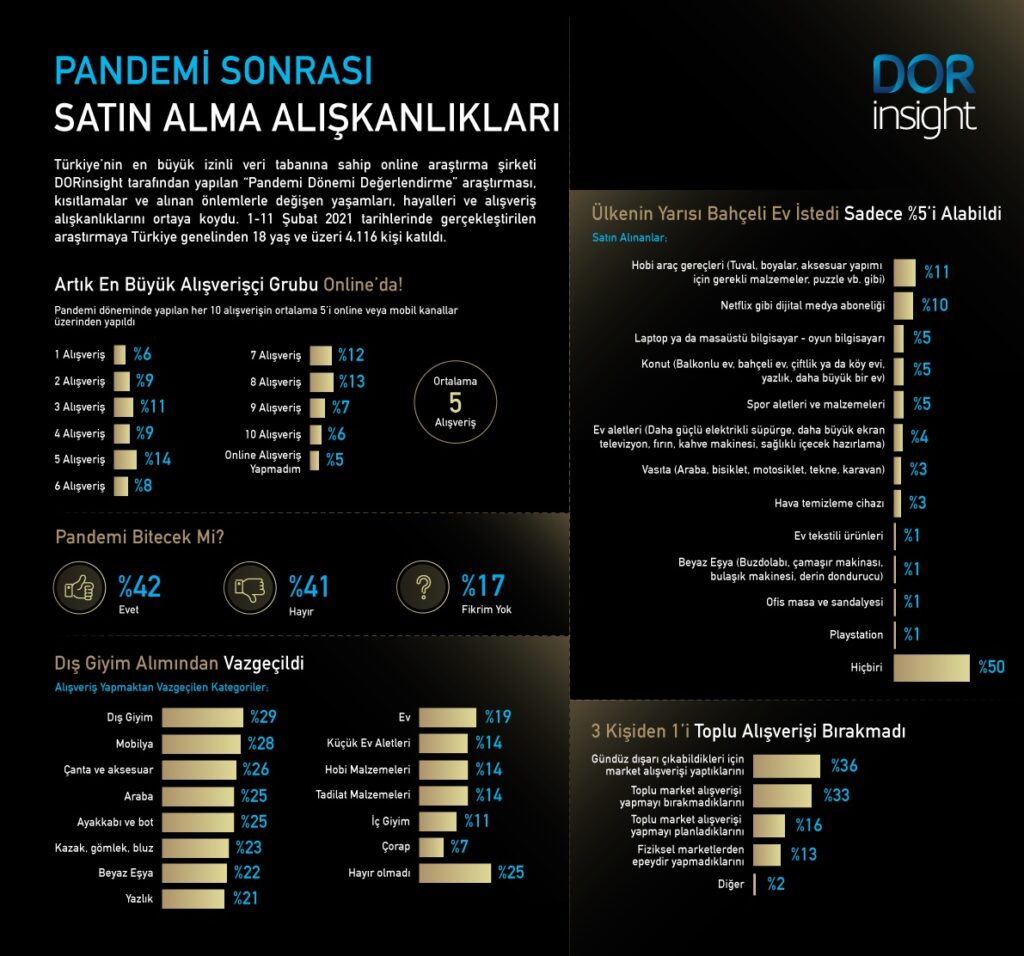 Hitay Holding bünyesinde faaliyet gösteren Türkiye’nin en büyük izinli veri tabanına sahip online araştırma şirketi DORinsight tarafından yapılan “Pandemi Dönemi Değerlendirme” araştırması ise kısıtlamalar ve alınan önlemlerle değişen yaşamları, hayalleri ve alışveriş alışkanlıklarını ortaya koydu.