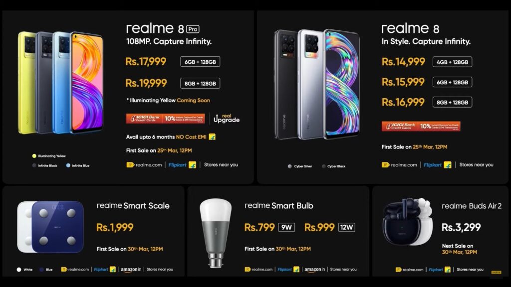 Realme 8’in başlangıç fiyatı 15.000 Hindistan Rupisi (vergiler hariç 1.638 TL) olarak belirlendi. Realme 8 Pro’nun başlangıç fiyatı ise 18.000 Hindistan Rupisi (vergiler hariç 1.966 TL) olarak açıklandı.