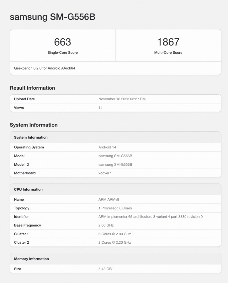 Samsung Galaxy XCover 7, MediaTek’in Dimensity 6100+ yonga seti ile Geekbench testlerine katıldı. Bu cihaz, testlerde tek çekirdekli olarak 663 ve çok çekirdekli olarak 1,867 puan aldı. Bu sonuçlar, Samsung’un sağlam akıllı telefon serisine yeni bir katkı olarak görülen Galaxy XCover 7’in performansını gösteriyor.