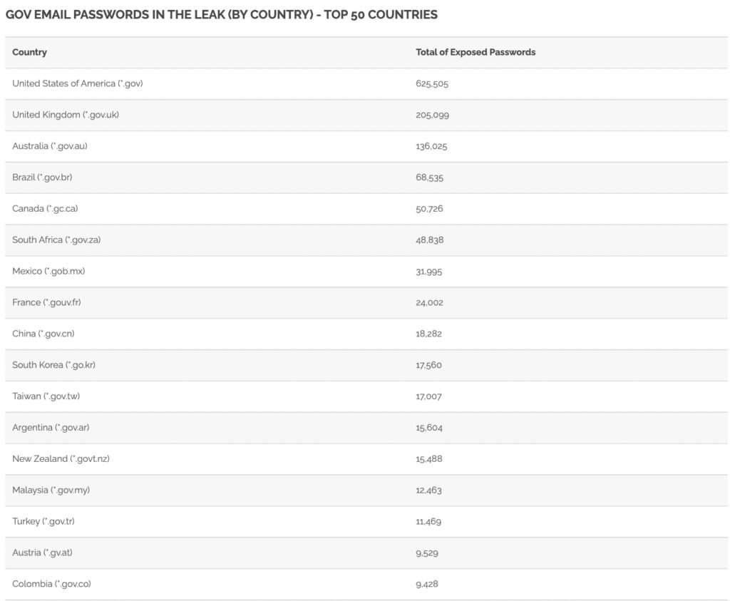 Dünyanın dört bir yanındaki kamu alanlarından gelen e-posta adresleriyle ilişkili 1.502.909 şifreyi de içeren sızıntıda, Türkiye hükümetine ait açığa çıkarılan şifrelerin sayısı 11 bin 469 iken, ABD hükümeti ifşa edilen şifrelerin 625.505’ini oluşturarak listenin tepesinde yer alıyor. ABD’yi sırasıyla İngiltere (205.099), Avustralya (136.025), Brezilya (68.535) ve Kanada (50.726) takip ediyor.