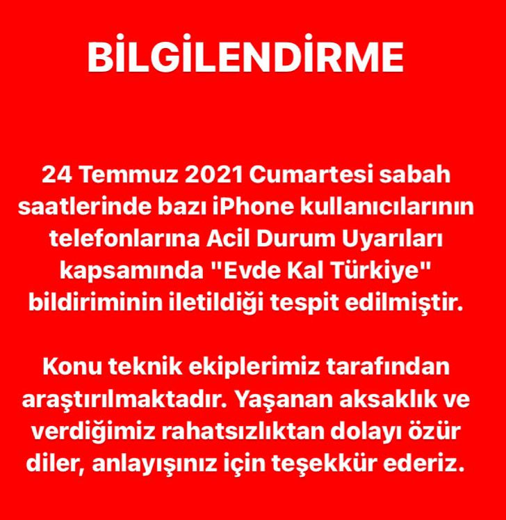 “24 Temmuz 2021 Cumartesi sabah saatlerinde bazı iPhone kullanıcılarının telefonlarına Acil Durum Uyarıları kapsamında “Evde Kal Türkiye” bildiriminin iletildiği tespit edilmiştir. Konu teknik ekiplerimiz tarafından araştırılmaktadır. Yaşanan aksaklık ve verdiğimiz rahatsızlıktan dolayı özür diler, anlayışınız için teşekkür ederiz.”