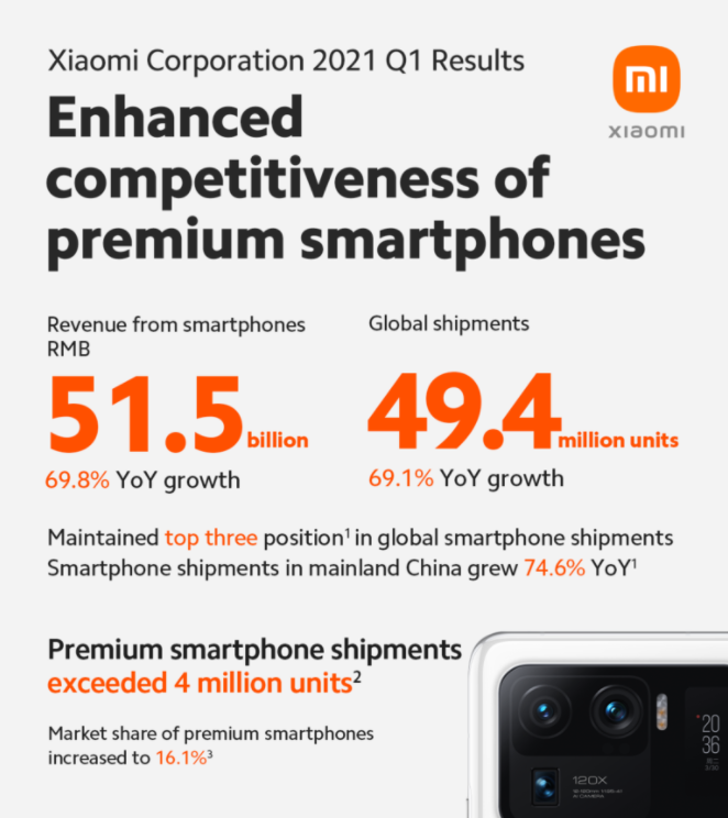 2021 yılının ilk çeyreğinde şirket, toplam 49,4 milyon ürün satışı gerçekleştirdi ve akıllı telefon işi için brüt kar yaklaşık yüzde 12,9 oldu. Hatta Xiaomi, küresel akıllı telefon pazarında sevkiyatlar açısından üçüncü konumunu korudu ve yüzde 14,1 pazar payına ulaştı. Çin’de ise marka, 4. oldu ve yüzde 14,6 pazar payına sahip oldu.