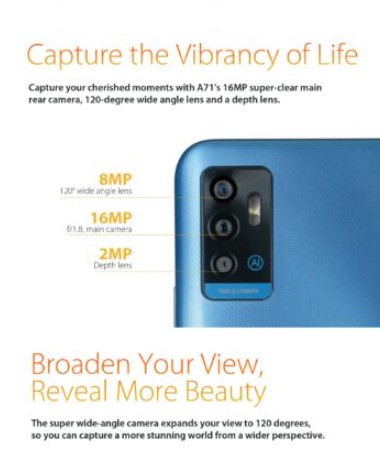 Blade A51’in iki kamerası varken, Blade A71’in üç kamerası var. 16 MP ana kamera ve 2 MP derinlik sensörünün yanı sıra, 8 MP 120 ° ultra geniş açılı kamera da bulunuyor. Telefonun yüz tanıma kilidi yer alırken yana monte edilen A51’deki arkaya monte edilmiş parmak izi tarayıcıyı değiştiriyor.