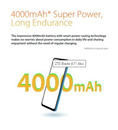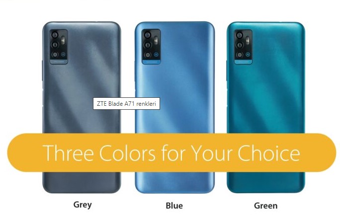 ZTE Blade A71, HD + çözünürlüğe ve su damlası çentiğine sahip bir 6.52 inç ekranı bulunuyor. Polikarbonattan yapılmış gibi görünen dokulu arka panelin altında 4000mAh pil bataryası yer alıyor. Cihaz için üç farklı renk seçeneği yer alıyor. Bunlar; Mavi, Gri ve Yeşil.