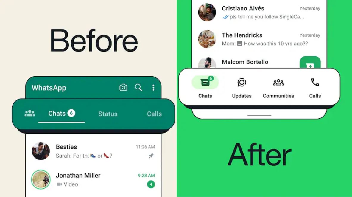 WhatsApp, Android kullanıcıları için uygulamanın alt kısmına yerleştirilen gezinme sekmelerini içeren bir güncelleme yayınladı. Bu yeni tasarım, kullanıcıların uygulamayı tek elle daha rahat kullanmalarını sağlıyor. Daha önce sohbet listesinin üstünde bulunan dört sekme artık ekranın alt kısmına taşındı ve simgelerle birlikte yeniden düzenlendi.
