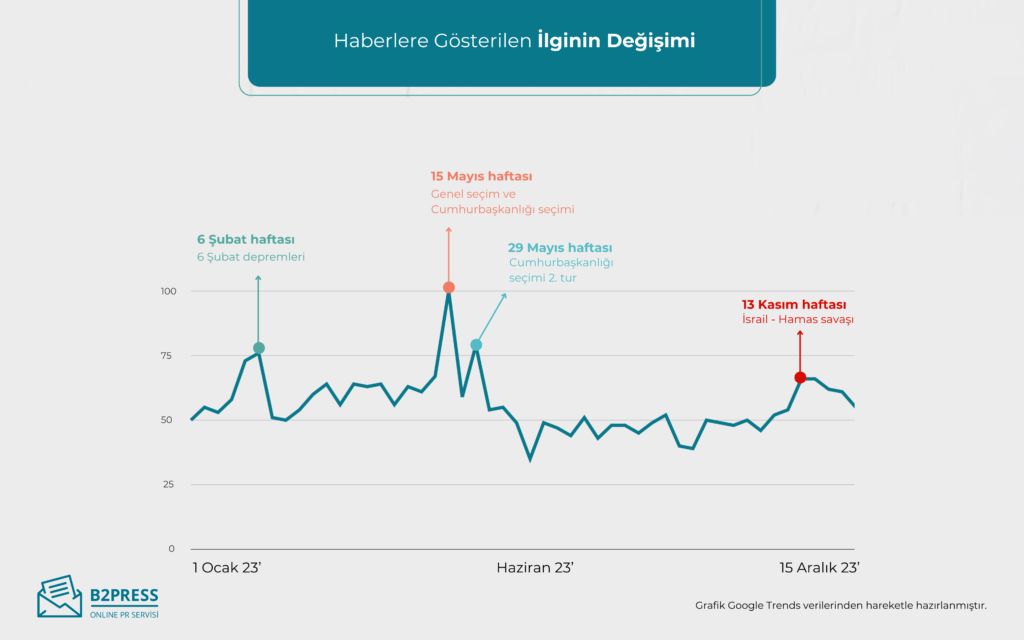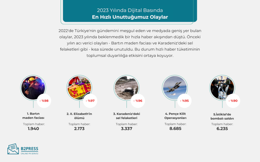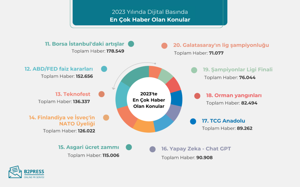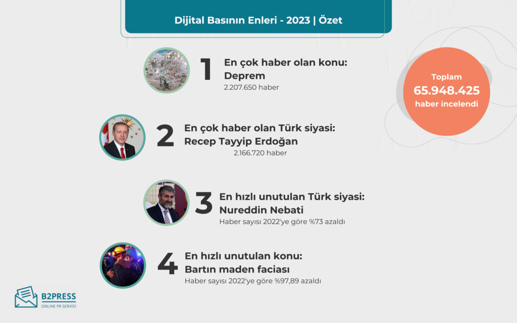 Bu sene 5.’si gerçekleştirilen ‘Dijital Basın Raporu 2023’ başlıklı araştırma, 2016 yılında faaliyetlerine başlayan B2Press tarafından hazırlanmıştır. Araştırma, 1 Ocak – 15 Aralık 2023 tarihleri arasında Türkiye’de faaliyet gösteren 30 binin üzerinde haber sitesinde yayınlanan 65,9 milyon haber, belirlenen anahtar sözcüklere uygun olarak incelenmiştir.