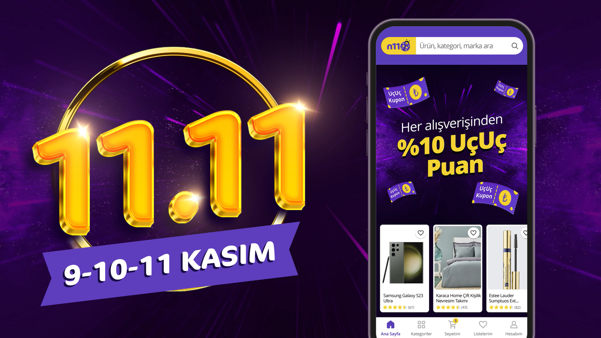 1-3 Kasım tarihlerindeki kampanyayı yoğun bir ilgiyle geçiren ve ay boyunca devam edecek fırsatları 9-10-11 Kasım tarihlerinde yoğunlaştıran n11’den kullanıcılarına milyonlarca sürpriz kupon, bu fiyata bu ürün olur mu dedirtecek 11 TL, 111 TL ve 1.111 TL’lik sabit fiyatlar, her alışverişten minimum %5 geri kazandıran UçUç Puanlar ile bir kısmı Türkiye’de ilk defa satışa sunulacak süper ürünlerde fırsat indirimler sunuluyor. n11’de anlık olarak dağıtılacak kuponları kaçırmamak ve fırsatları yakalamak için herkesin uygulamadaki hesabını kontrol etmesi ve bildirimlerini açması gerekiyor.