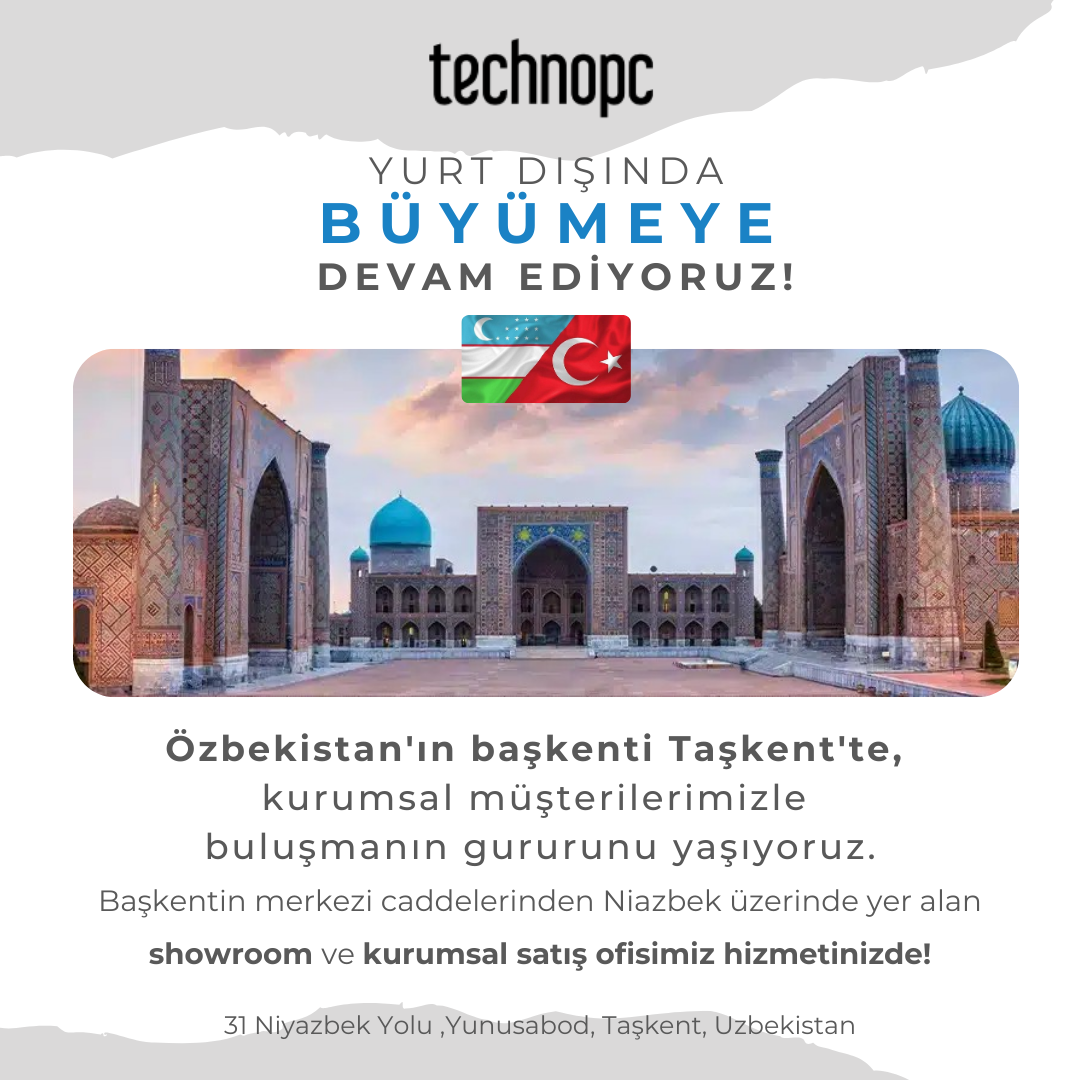 Yurt dışındaki varlığımızı güçlendirme yolunda önemli bir adım olan Technopc Taşkent showroom ve kurumsal satış ofisimizle, Özbekistan’daki müşterilerimize en yüksek kalitede hizmet sunmaya devam edeceğiz. Alanında uzman ekibimizle, Taşkent’te de teknoloji ve inovasyonun öncüsü olma misyonumuzu sürdüreceğiz.