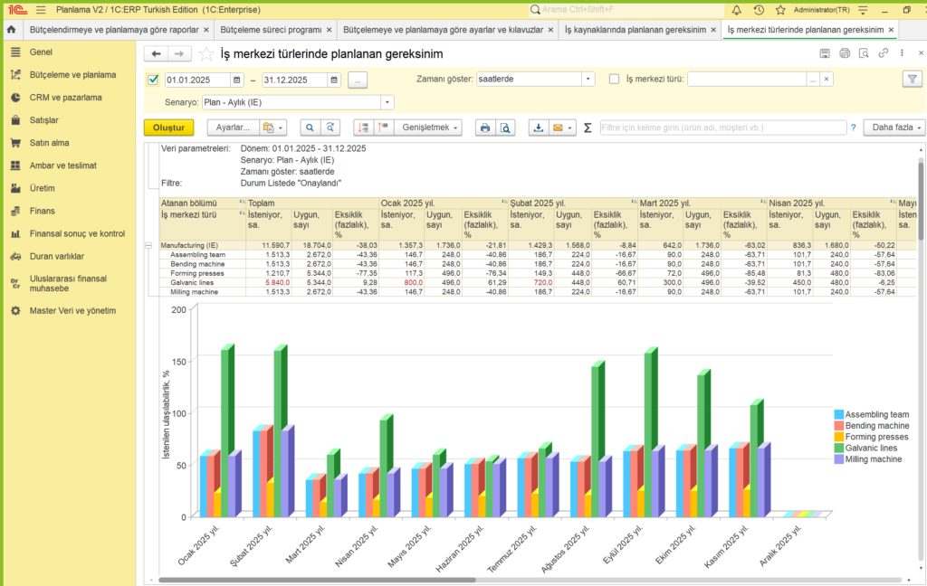 1C:ERP, 70’ten fazla uçtan uca süreci destekleyen hepsi bir arada bir ERP sistemidir ve iş ihtiyaçlarınız için kapsamlı bir çözümdür. 1C:ERP büyük üretim şirketleri için tasarlanmıştır, ancak perakende, enerji, inşaat ve diğer birçok sektörde de başarılıdır.